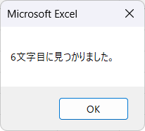 Instr関数を呼び出して、「私の趣味は読書です」の文字列中に「読書」の文字が含まれるかを探しています。見つかった場合、その位置が変数posに代入されます。最後に見つかった位置をメッセージボックスで表示しています。